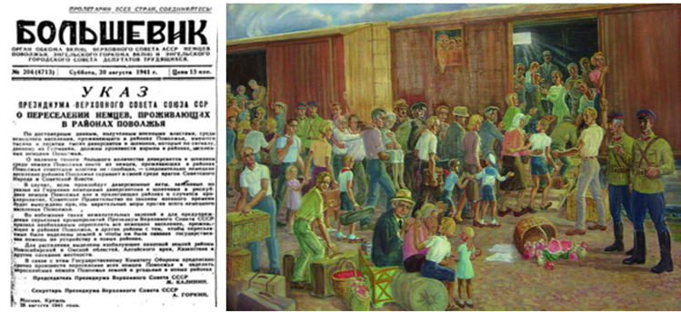 Первая страница газеты «Большевик» с текстом Указа Президиума ВС СССР «О переселении немцев, проживающих в районах Поволжья». Картина художника Бруно Диля «Сентябрь 41 года» (будучи советским немцем, в четырнадцать лет он был в составе своей семьи депортирован из города Энгельса в Красноярский край, в городе Канске которого, он, так и не вернувшись в Поволжье, прожил до конца свой жизни).