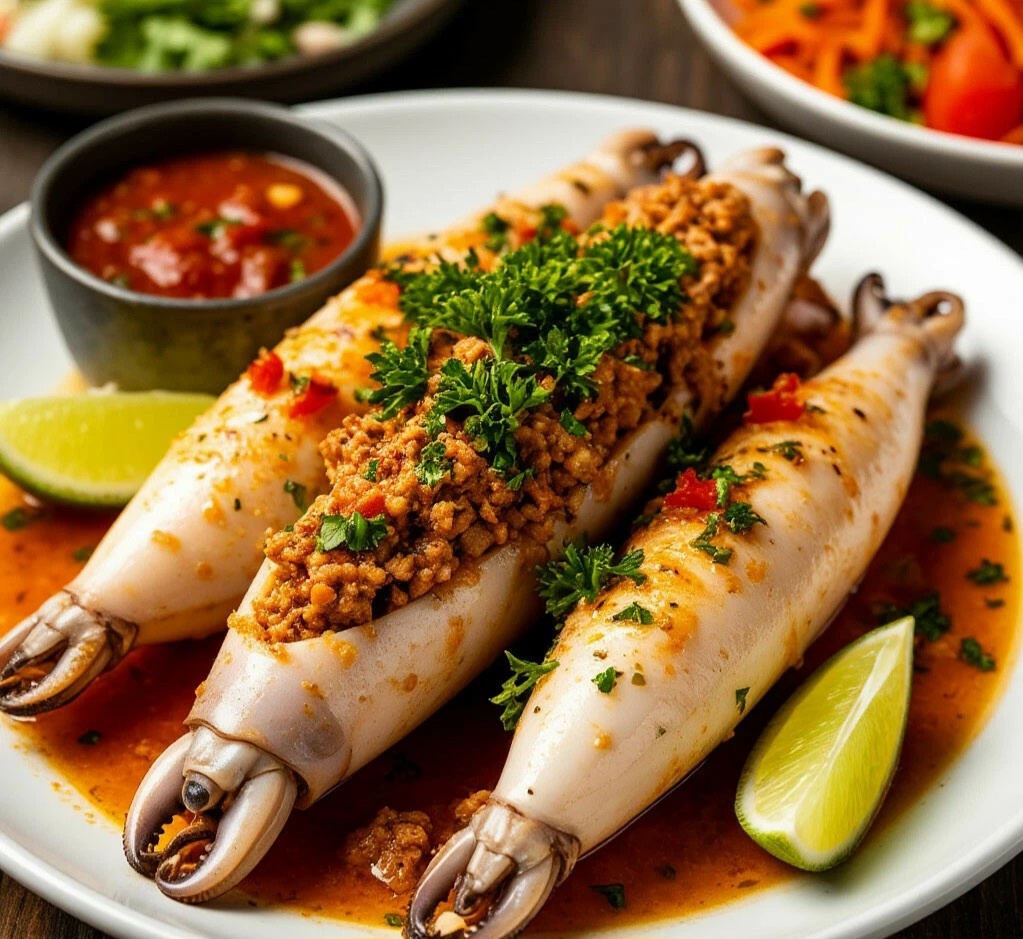 * Приготовление: отварите кальмары 10–15 секунд, начините смесью из обжаренных грибов и лука. Запекайте 20–25 минут при 180°C, полив соусом из сливок и сыра.