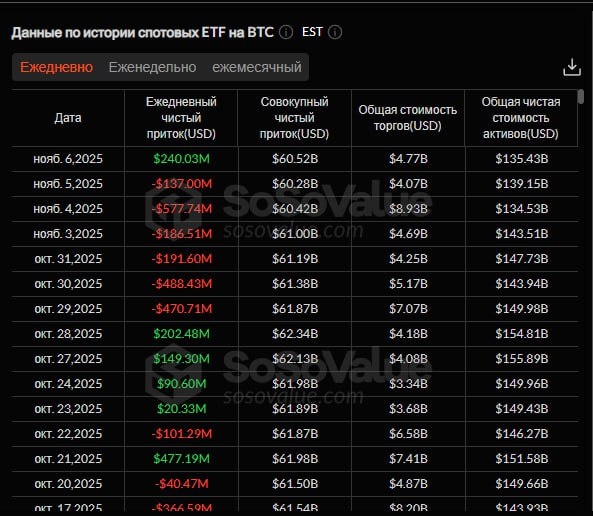 πΈ6 Π½ΠΎΡΠ±ΡΡ ΡΠΏΠΎΡΠΎΠ²ΡΠ΅ Π±ΠΈΡΠΊΠΎΠΈΠ½-ETF Π·Π°ΡΠΈΠΊΡΠΈΡΠΎΠ²Π°Π»ΠΈ ΠΎΠ±ΡΠΈΠΉ ΡΠΈΡΡΡΠΉ ΠΏΡΠΈΡΠΎΠΊ Π² ΡΠ°Π·ΠΌΠ΅ΡΠ΅ $240 ΠΌΠ»Π½, ΠΏΠΎΠ»ΠΎΠΆΠΈΠ² ΠΊΠΎΠ½Π΅Ρ ΡΠ΅ΡΠΈΠΈ ΠΎΡΡΠΎΠΊΠΎΠ² ΠΈΠ· ΡΠ΅ΡΡΠΈ Π΄Π½Π΅ΠΉ. Π‘ΠΏΠΎΡΠΎΠ²ΡΠ΅ ETF Π½Π° ΡΡΠΈΡΠΈΡΠΌ ΡΠ°ΠΊΠΆΠ΅ ΠΏΠΎΠΊΠ°Π·Π°Π»ΠΈ ΡΠΈΡΡΡΠΉ ΠΏΡΠΈΡΠΎΠΊ Π² ΡΠ°Π·ΠΌΠ΅ΡΠ΅ $12,51 ΠΌΠ»Π½. ETF Π½Π° Solana ΠΏΠΎΠΊΠ°Π·Π°Π»ΠΈ ΡΠΈΡΡΡΠΉ ΠΏΡΠΈΡΠΎΠΊ Π² ΡΠ°Π·ΠΌΠ΅ΡΠ΅ $29,2 ΠΌΠ»Π½.