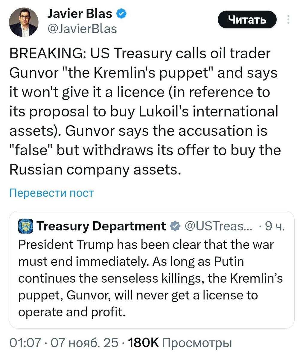 Пацаны к успеху шли, но не фартануло, не прокатило. А всего-то надо было Эрика или Дональда младшего в долю взять. Контекст: Нефтетрейдер Gunvor решил отозвать свое предложение о покупке зарубежных активов ЛУКОЙЛа после заявления Минфина США о том, что он не даст компании лицензию до окончания боевых действий.