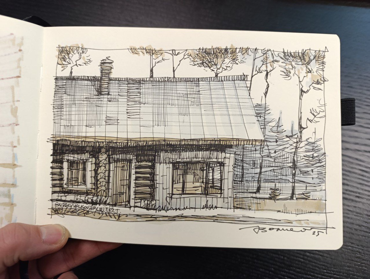 Немного раскрасил утреннюю картинку, передний план стал "тёплым", дальний холодным, что в классическом раскладе создаёт иллюзию воздушной перспективы на двухмерном пространстве блокнотного листа!))) #volkovsketchbook #andreyvolkovarchitect