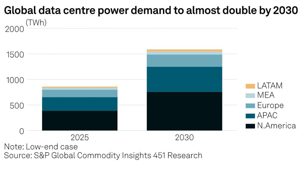 Общий мировой спрос на электроэнергию со стороны центров обработки данных, по оценкам 451 Research, увеличится с 860 ТВт·ч в 2025 году до