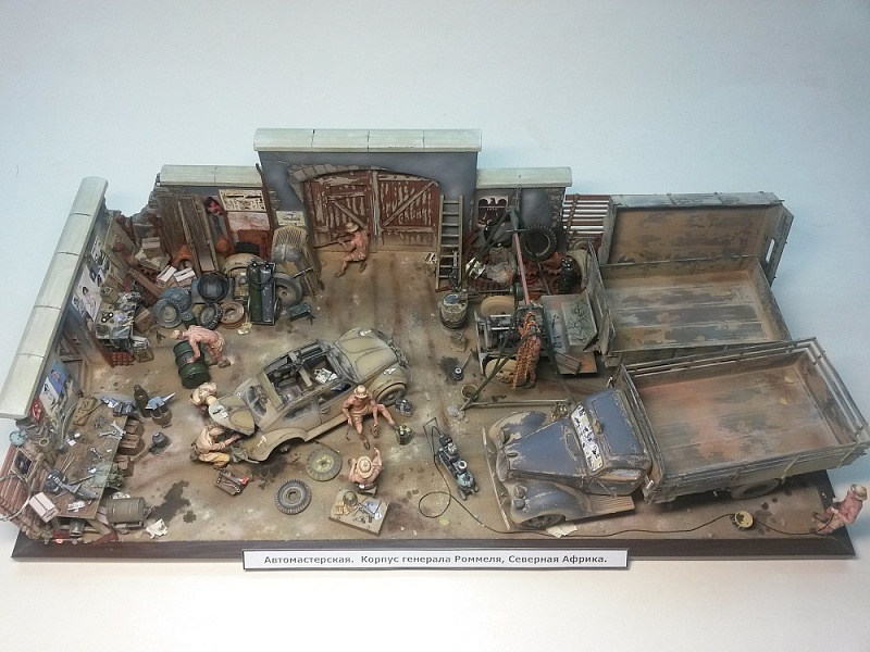 Автомастерская.Корпус генерала Роммеля.Африка. Арнольд Арчебасов ICM, Italeri, MiniArt, Tamiya, 1:35 ================================ Сюжет бытовой, рабочий день в автомастерской, где-то в Африке, в корпусе " Пустынного Лиса ", генерала Роммеля ;). Грузовики -от ИСМ, кусок стены от Миниарта, люди- Миниарт, тамия, итал. Фолькс-не знаю, купил в одном пакете, даже без инструкции. Всё остальное : кое-что наборы деталировки, кое-что травло, а остальное -сам. Краски и тонировка как обычно: аэр, смывка и пигменты. ================================ ===============================