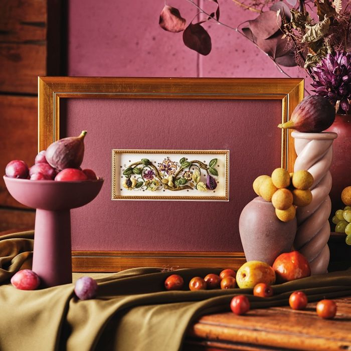 Панно «Елизаветинской эпохи» от Сьюзен Кассон Богатое символизмом и великолепием панно «Елизаветинской эпохи» Сьюзен Кассон отдает дань уважения одной из самых декоративных эпох в истории — времени, когда вышивка была в равной степени выражением мастерства и показателем социального статуса. Этот проект черпает вдохновение в роскошных украшениях, которые когда-то украшали королевские одеяния и величественные интерьеры, и отражает величие елизаветинского орнамента посредством иглы и нитки. Панно в елизаветинском стиле полностью соответствует своему названию — это удивительно пышное и объемное произведение, в котором каждый элемент тщательно подобран, чтобы отразить мотивы, определявшие дизайн шестнадцатого века. В основе панно «Елизаветинская эпоха» лежит цветущая виноградная лоза — символ жизни и роста, которая вьется по всему дизайну, объединяя каждый мотив в изящном ритме. Из этого центрального стебля прорастает изобилие природы: спелый гранат, полный обещаний, инжир и ягоды, символиз