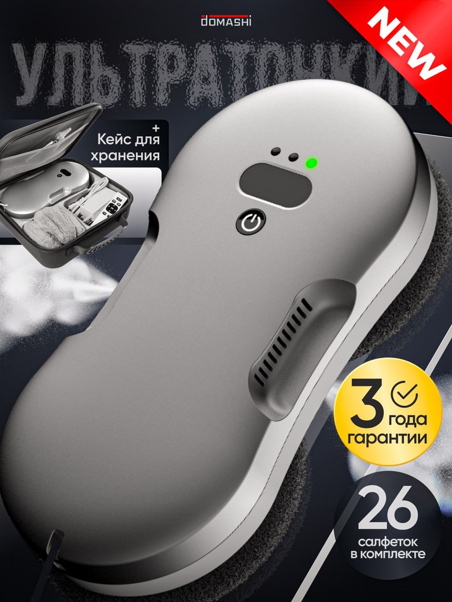 🎉 Встречайте! Наша новинка — Domashi Lumi. Элегантный, умный и создан для тех, кто ценит чистоту и эффективную уборку. Domashi Lumi — это сочетание минималистичного дизайна и технологий нового уровня. Двустороннее ультразвуковое распыление распределяет моющее средство равномерно, а ультратонкий корпус всего 65 мм позволяет роботу работать на окнах с решетками. ✨ Что делает Lumi особенным: • стильный минималистичный дизайн, который выглядит премиально; • двустороннее ультразвуковое распыление — равномерная чистота без разводов; • запуск в одно касание— просто нажмите кнопку и наблюдайте, как робот создает чистоту и уют в вашем доме; • кейс для хранения робота и принадлежностей — порядок гарантирован; • дополнительный комплект салфеток позволит за один раз помыть 6-7 окон. ✅ Lumi подойдет для тех, кто: - любит большие панорамные окна - ценит своё время - любит чистоту и уют дома - живет на высоком этаже.