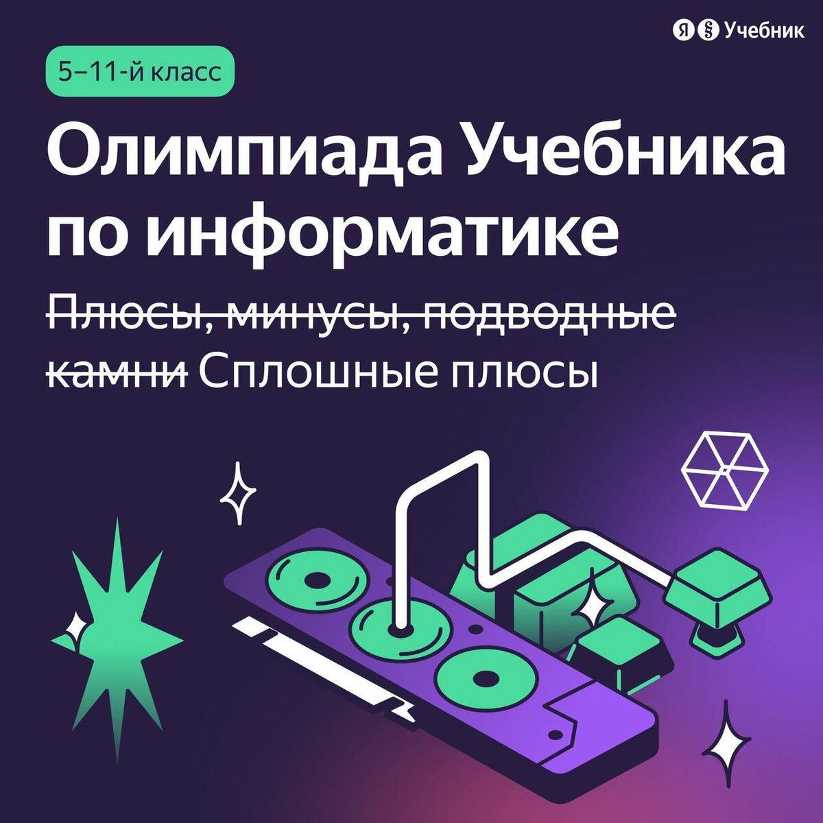 Яндекс Образование проведёт олимпиаду по информатике для школьников: https://clck.ru/3Px93q Она будет полезна и интересна любому — и пятикласснику, который только вчера начал изучать программирование, и выпускнику с планами сдавать профильный ЕГЭ. «Кубок Яндекс Образования» направлен на развитие креативного и алгоритмического мышления, рекомендован Минпросвещения России и выступает партнером конкурсов портфолио «Талант НТО» и Яндекс Лицея. Победители среди 8-11 классов смогут получить дополнительные баллы при поступлении в вузы, а 100 сильнейших участников второго тура отправятся на очный этап в Москву.