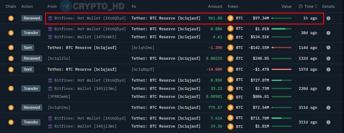 🤩 Компания Tether докупила 961 BTC ($97m) в свои резервы – arkham