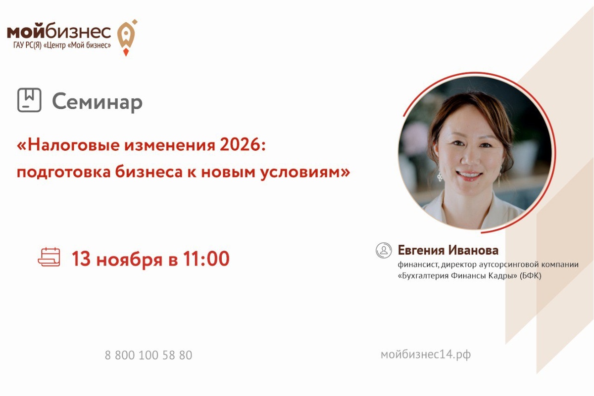 🚀Центр «Мой бизнес» приглашает вас на очный бесплатный семинар «Налоговые изменения 2026: подготовка бизнеса к новым условиям». ✔️С 1 января 2026 года порог превышения выручки для уплаты НДС снижается с 60 млн руб до 10 млн руб. Это значит, что к налогам УСН добавится ещё 5% от оборота, что может превысить 20% прибыли — особенно в рознице и услугах с низкой маржой. На вебинаре вы узнаете, как подготовиться налоговым к изменениям. 📝Программа семинара: 1. Какие изменения вступят в силу с января 2026; 2. Как подготовиться к изменениям; 3. Как бизнес переходил на НДС в 2025 году (порог 60 млн руб), реальные кейсы; 4. Ответы на вопросы. 🎙Спикер: Евгения Иванова, финансист, директор аутсорсинговой компании «Бухгалтерия Финансы Кадры» (БФК) 📆Дата: 13 ноября 2025 года ⏰Время: 11:00 – 13:00 📬Место: г. Якутск, ул. Кирова, 18, блок Б, 1 этаж, «Центр «Мой бизнес», конференц-зал 🔗Регистрация по ссылке: https://forms.yandex.ru/cloud/690d86f24936397c039376f8 🤝Развивайте бизнес с нами!