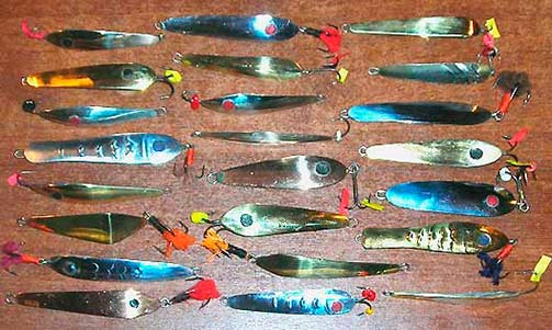 «Блесны этого типа изготавливались из несколько изогнутой металлической пластины овально-вытянутой, подпрямоугольной или листовидной формы, один конец которой сужался и переходил непосредственно в крючок, а на другом пробивалось отверстие для привязывания лески. Длина таких блесен доходила до 20 см. В