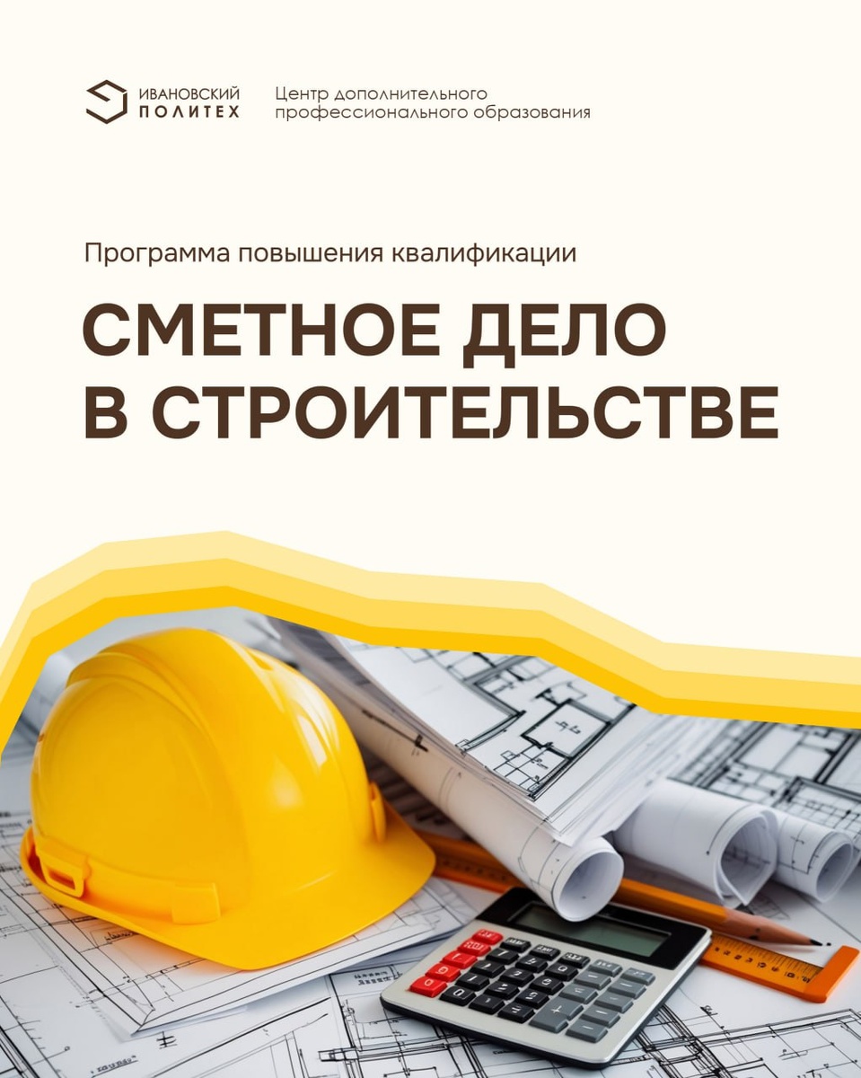 Ивановский Политех объявляет набор на обучение по программе повышения квалификации «Сметное дело в строительстве» Данный курс предлагает полный обзор всех аспектов сметного дела, чтобы вы смогли эффективно составлять и анализировать сметы на строительные проекты. Вы изучите основы сметного дела, методики расчета затрат, практические навыки составления сметы в программе «ГРАНД-Смета», а также узнаете о актуальных тенденциях и требованиях в сметном деле. Не упустите возможность стать профессионалом в сметном деле! 🔹 Напоминаем, что для студентов Ивановского Политеха предусмотрены скидки на все курсы ДПО 📅Старт обучения — 18 ноября 👉Предварительная запись на курс ТУТ Вся подробная информация: ✉️ 380181@mail.ru 🚪 ГШ-155 #дпо@ivgpu