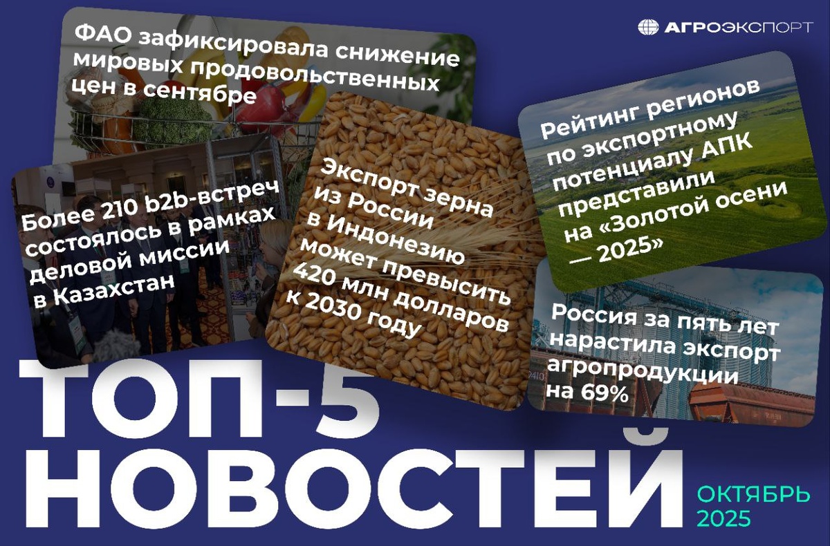 Более 210 b2b-встреч состоялось в рамках деловой миссии в Казахстан. Агроэкспорт Экспорт зерна из России в Индонезию может превысить 420 млн долларов к 2030 году. Финмаркет Рейтинг регионов по экспортному потенциалу АПК представили на «Золотой осени — 2025». Агроэксперт ФАО зафиксировала снижение мировых продовольственных цен в сентябре. FAO 📊Россия за пять лет нарастила экспорт агропродукции на 69%. Российская газета