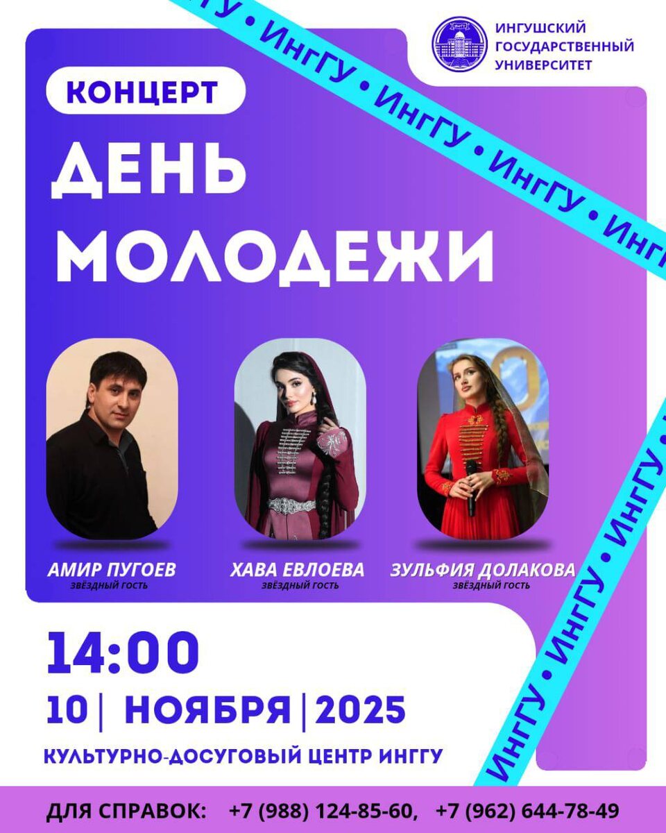 🎤 Грандиозный концерт ко Дню молодежи уже 10 ноября! Готовьтесь к взрыву эмоций! Ждем всех в Досуговом центре в 14:00 на самом ярком событии этой осени! В программе: ✨ Звездные гости: Хава Евлоева, Амир Пугоев, Зульфия Долакова и другие! ✨ Наши невероятно талантливые студенты! ✨ Яркие выступления иностранных студентов! Это не просто концерт! 💝 · Вся сумма с проданных билетов пойдет на благотворительность! · Так что вы получите не только крутые эмоции, но и сделаете доброе дело! Условия: 🎫 Стоимость билета: всего 100 рублей. 🚨 Количество мест ОГРАНИЧЕНО! Не затягивайте с покупкой! Как купить? 📩 Писать в личные сообщения профкому своего факультета! +7 922 489-73-42 - Медицинский Институт +7 905 790-00-40 - Институт Иностранных языков и регионоведения +7 920 754-93-70 - Инженерно-Технологический Институт +7 928 799-18-80 - Исторический Факультет +7 962 641-14-11 - Педагогический Факультет +7 938 008-96-95 - Филологический Факультет +7 918 819-41-34 - Юридический Факультет +7 9