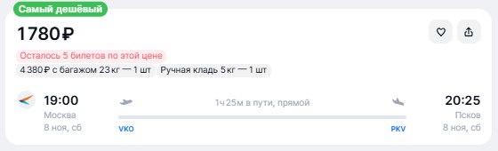 ✈️Москва - Псков, в одну сторону от 1780 рублей