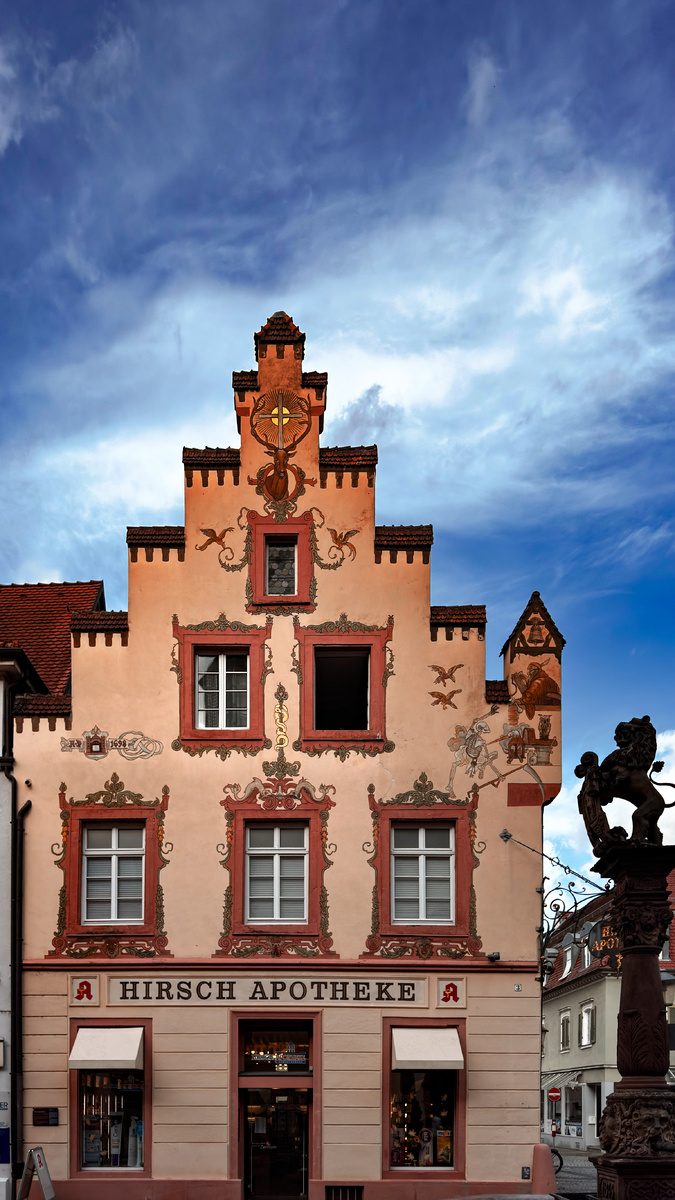 Прохожу по центру Оффенбурга и взгляд цепляется за фасад аптеки Hirsch. С первого взгляда — обычное старое здание. Но если поднять голову выше витрин, там начинается самое интересное. В самом верху — олень с крестом. Это старинный символ аптеки и знак святого Губерта, покровителя охотников и лесов. А ниже — целая история, написанная прямо по штукатурке: птицы, орнамент, фигуры. И среди них — то, что сложно не заметить — скелет с косой, аккуратно нарисованный на правой стороне фасада. Он не случайный и не «страшилка» — такие образы раньше напоминали о бренности жизни и ценности здоровья. Memento mori, но на языке повседневности. Идёшь по городу, смотришь на аптеку — а перед тобой не просто здание, а разговор времени с тобой. Тихий, но прямой.