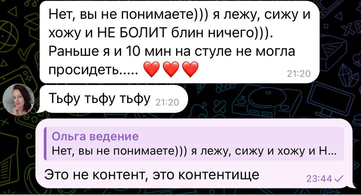 Старт программы "Здоровая спина за 30 дней" Если после домашних дел тебе тяжело разогнуться, а от того, что моешь посуду — горит между лопатками, если сидишь — начинает ныть и тянуть, а к вечеру спина как камень, Читай внимательно 👇 Я зову тебя на программу “Здоровая спина” — восстановление за 30 дней Это не зарядка и не растяжка. Это программа, в которой ты поймёшь, почему болит именно твоя спина, и научишься снимать боль, не усилием, а пониманием тела. Что будет на курсе: ▪️ простые упражнения по 15–20 минут в день — без боли и фанатизма; ▪️ объяснение, зачем ты делаешь каждое движение, и как этим разгрузить позвоночник; ▪️ восстановление нормальной осанки — без “тянуть лопатки вниз” и “держать спину прямо через напряжение”; ▪️ заметный результат уже через 2–3 недели — без обострений и “каменной шеи, поясницы" Пример Оли — она предпринимательница. Во время работы ныла и сковывалась спина и шея Через месяц: “Вы не понимаете: я целый день сижу и НИЧЕГО НЕ БОЛИТ"! Про Олю тут