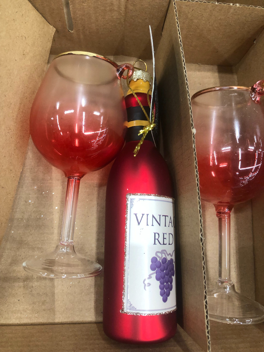 Вы только посмотрите, какая интересная вещица. Это набор елочный украшений "Вино и бокал". Я первый раз вижу такой декор интересный. Размерчик внушительный. Примерно 13-14 см. Материал: стекло. Очень оригинальное украшение. Производитель Китай. Стоимость 479 рублей.