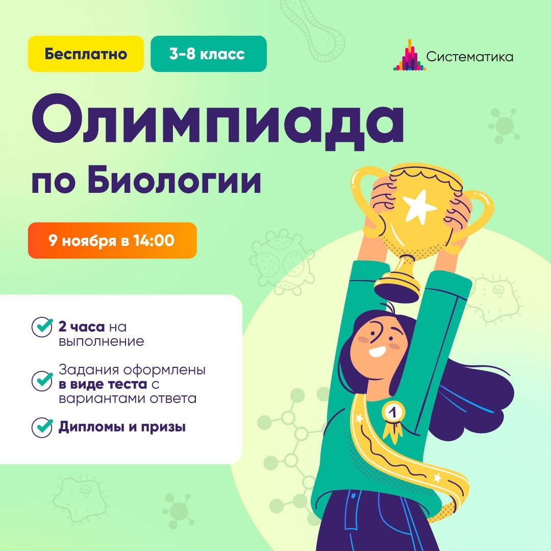 Для тех, кто пропустил⬇️ VIII Международная олимпиада Систематики по биологии состоится в воскресенье 9 ноября в 14:00 🟢На выполнение задания — 2 часа 🟢Для учеников 3-8 классов 🟢Участие бесплатное 🏆На прошлой олимпиаде мы получили более 1 000 работ Организационный комитет состоит из призеров и победителей олимпиад по биологии, а также авторов Всероссийской олимпиады школьников. Олимпиадные задания охватывают все разделы биологии, входящие в школьную программу. Призеры получают дипломы и небольшие призы в Систематике Как проходит олимпиада? ✔️Все одновременно получают задание на онлайн-платформе. ✔️Решаем задания на платформе. Выбираем верные ответы в тестовых заданиях или заполняем поле для ответа в задачах без вариантов ответа. ✔️Во время олимпиады ведётся трансляция в zoom. Можно задать голосом вопрос и видеть других участников. 📍ЗАРЕГИСТРИРОВАТЬСЯ НА ОЛИМПИАДУ