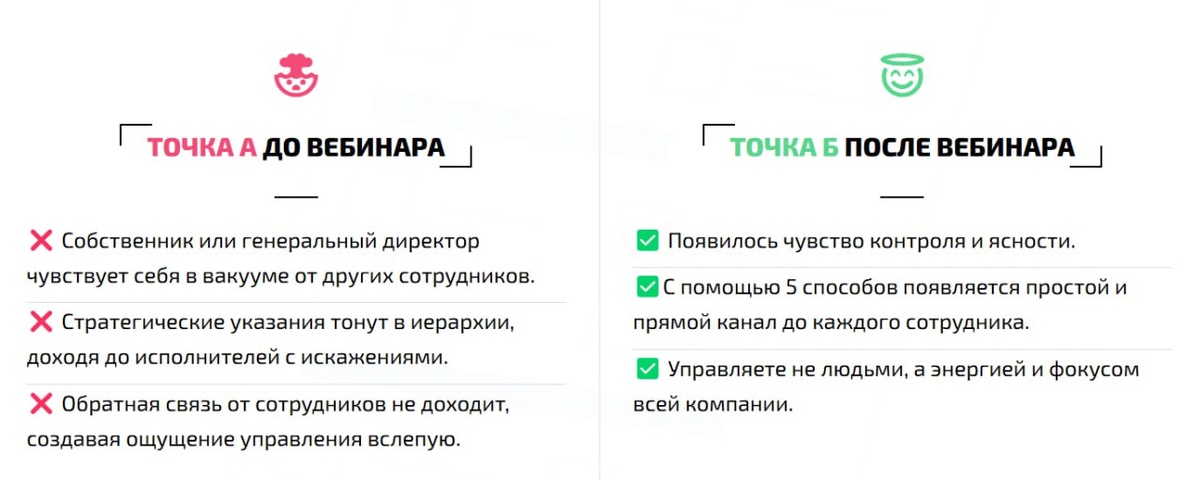 Добрый день, коллеги! Компания выросла. И вы чувствуете стену между собой и большинством сотрудников, теряете обратную связь. Знакомо? 🔺Вы чувствуете, что информация от вас до линейного сотрудника доходит с искажением, получается испорченный телефон. 🔺Новые сотрудники не знают ваших ценностей и приоритетов. 🔺Вместо результата, люди пытаются добыть достоверную информацию, в худшем случае, начинают создавать свои "кружки", невыгодные компании. ✨11 ноября в 11:00 (мск) на бесплатном вебинаре с Ольгой Жуковой расскажем: 🔺5 способов доносить информацию из первых рук. 🔺Как слышать каждого, даже если у вас 80+ сотрудников. 🔺Способы отмечать и поощрять лучших, чтобы не было "дедовщины" талантов. Кому будет полезно: ✔️ Собственникам бизнеса ✔️ Генеральным директорам ✔️ Топ-менеджерам Продолжительность: 30-40 минут + ответы на вопросы. 👉 Забронируйте место сейчас: https://kit-media.ru/ceo_connecttoall_bitrix24/