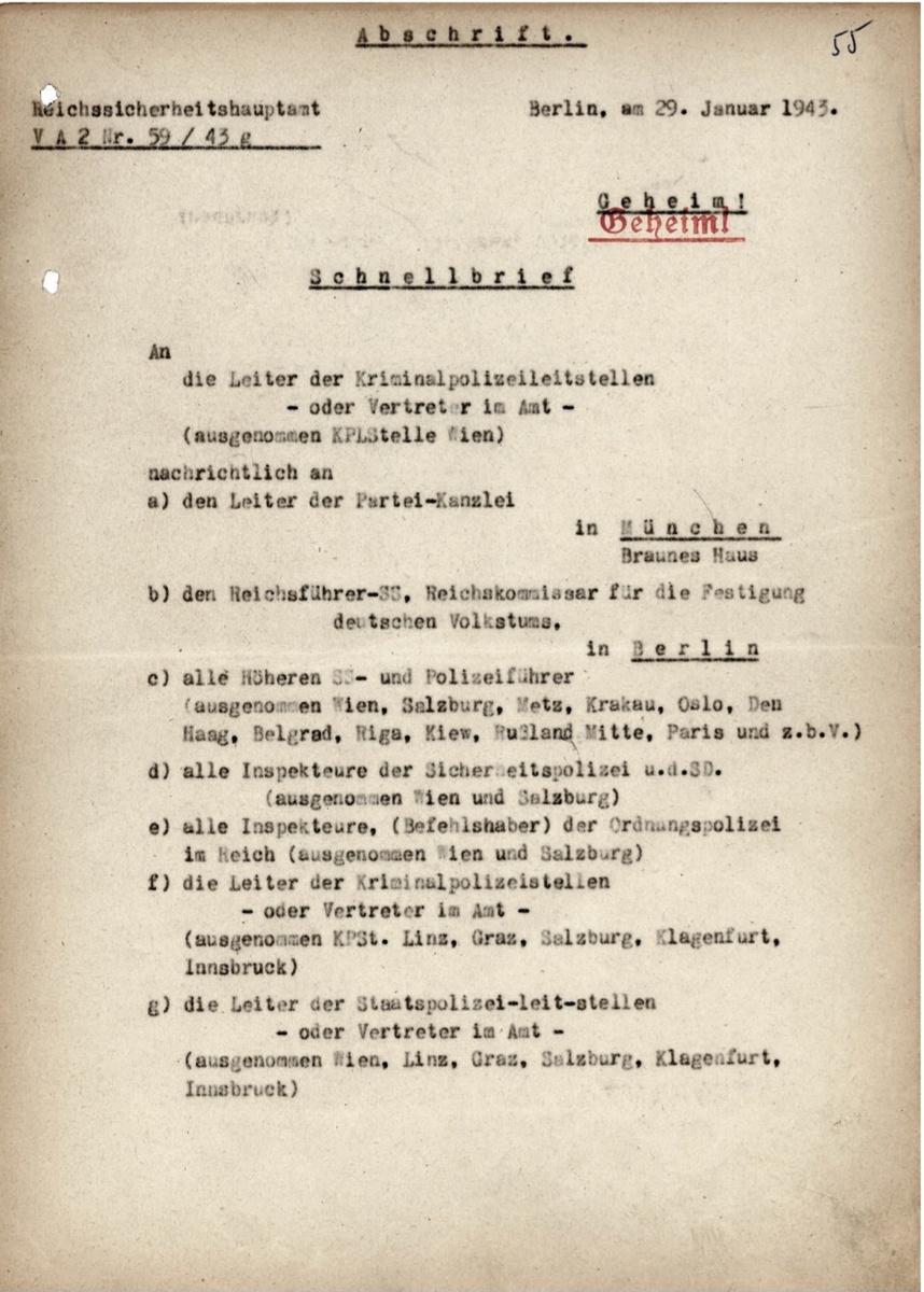 Оригинал этого декрета/указа не сохранился, но по нему из RSHA 29.01.1943 были отправлены директивы/письма во все соответствующие заведения Германии (полиция и т.д.)