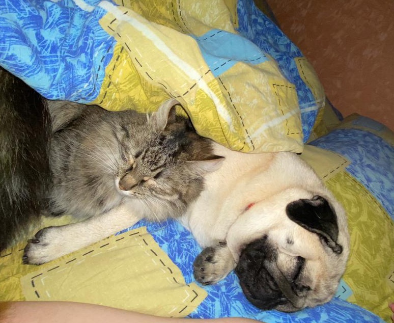 Наверное у каждого из нас есть своё продолжение этой фразы... Моё утро начинается с МОПСА🐶 и иногда к нам присоединяется кошка)) Так получилось, что в нашей семье 6 лет назад появилась собака. Муж с дочкой очень хотели завести мопса, а я вообще была против любой собаки. Потому что до этого у нас была спаниель, и когда она умерла, я очень тяжело переносила потерю... Но время лечит и я поддалась на уговоры и у нас появился мопс, активная на тот момент девочка, которую я почему то назвала Бася. И все согласились. Сначала щенок-мопсик привязалась к дочке и спала с ней и ходила за ней как хвостик. А потом что-то пошло не так)) И наша Бася стала моим хвостиком. Каждую ночь она спит прижавшись ко мне. И как говорится, закидайте меня тапками, что это не правильно, но я не могу выгнать её. Она ложится с краю кровати на одеяло, но всегда прижавшись ко мне. Если ей жарко, она уходит в ноги, но обязательно прижмется к моей ноге. Вот так и живем. Поэтому моё утро начинается с мопса Баси! Она ут