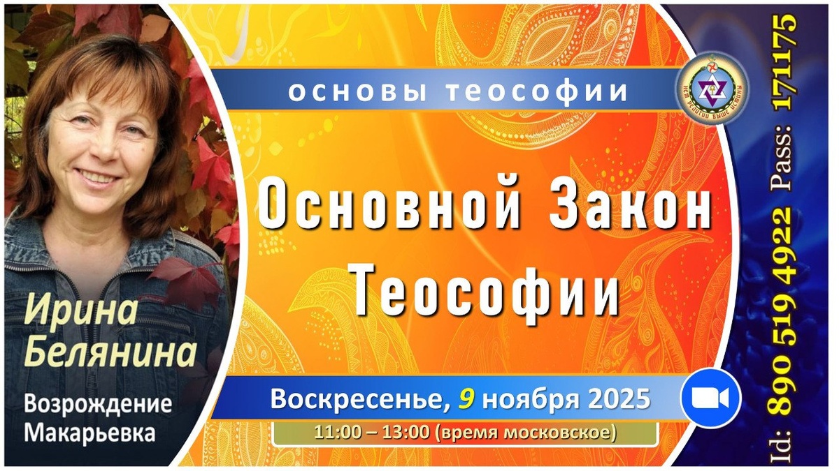 🎈🎈🎈В это воскресенье, 9 ноября 2025 года, в рамках проекта «Основы теософии» состоится беседа на тему "ОСНОВНОЙ ЗАКОН ТЕОСОФИИ" 💡ВЕДЕТ: Ирина Белянина (с. Макарьевка, отд. "Возрождение") ⏰Начало встречи в 11:00 (Время московское). 🔵Вход в ZOOM: www.zoom.us Id: 890 519 4922 Pass: 171175 Быстрый вход в лекторий по ссылке: https://clck.ru/37Q6hC ✅ Приглашаем вас к участию, совместному исследованию и обсуждению! ❗️Все вопросы вы можете направить по адресу: secretary@ts-russia.org
