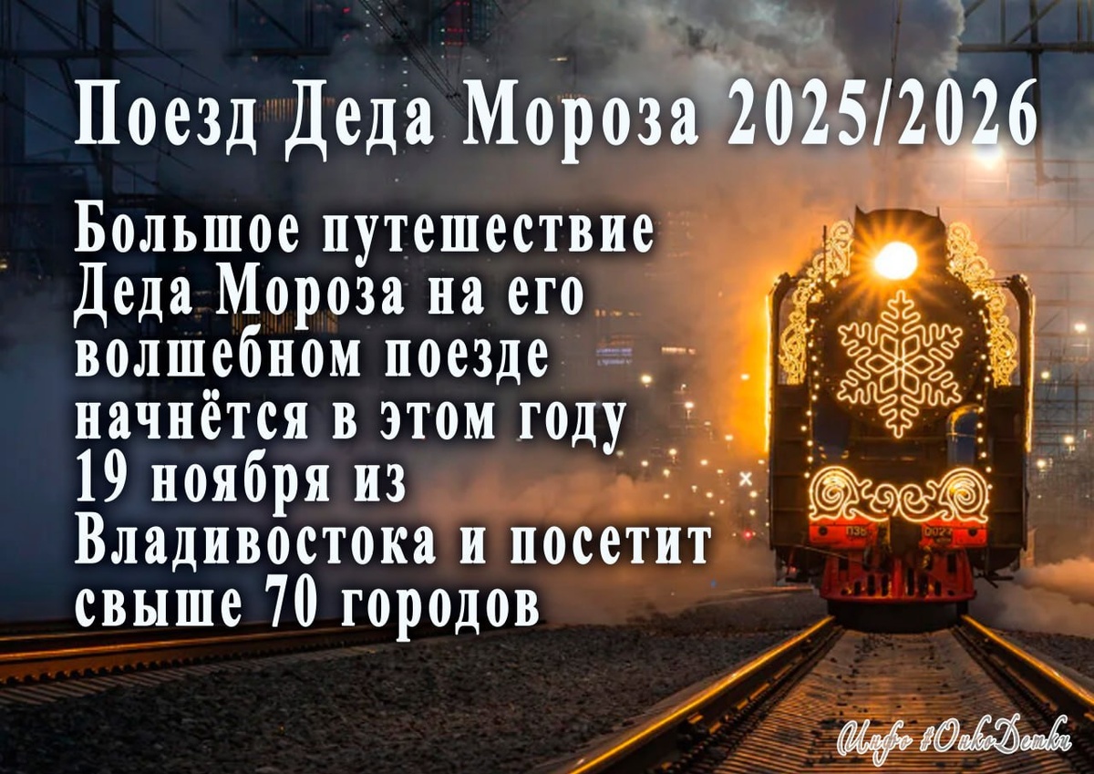 ✨Поезд Деда Мороза 2025/2026 Большое путешествие Деда Мороза на его волшебном поезде начнётся в этом году 19 ноября из Владивостока и посетит свыше 70 городов 8 ноября: Поезд Деда Мороза можно будет увидеть и сфотографировать на тестовых прогонах в Москве и области: • 7:10 – 7:50: Московское центральное кольцо (участок Хорошёво – Владыкино). • 11:40 – 18:00: Следование поезда с легендарным электровозом ЧС6 на участке Мытищи – Сергиев Посад – Александров – Ярославль – Данилов. 9 ноября: Главный зимний волшебник страны у себя на родине, в Великом Устюге, проверит готовность поезда и отправится на нём во Владивосток. Именно этот город станет отправной точкой его пятого большого путешествия, которое начнётся на Транссибе. ❗️Маршрут по городам будет опубликован 9 ноября 19 ноября: Официальный старт большого путешествия из Владивостока. Поезд посетит свыше 70 городов. Продажа билетов на праздничную программу в поезде и кукольный спектакль откроется на первый участок пути (до Омска) с