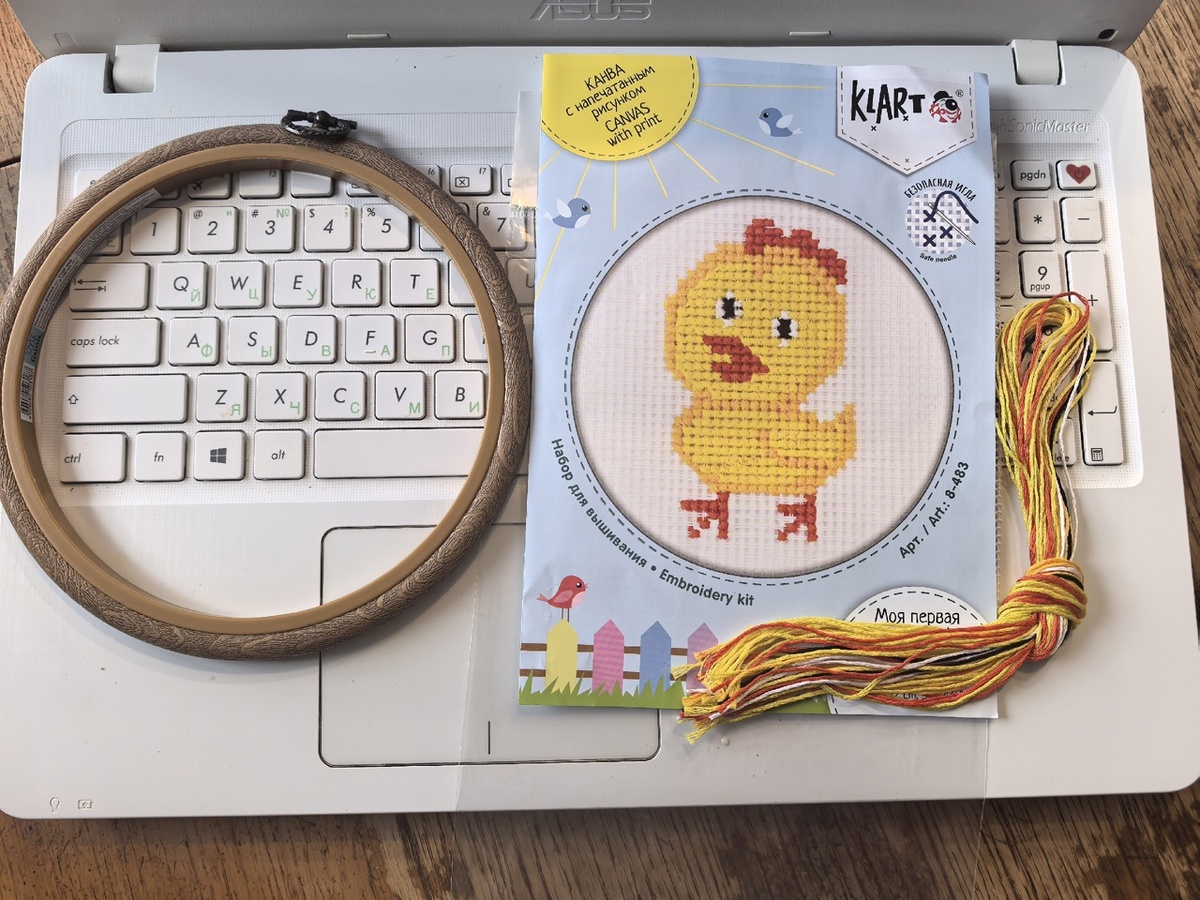 Вышивок, конечно, море. Столько много всего красивого! Я сначала хотела взять «Утро в сосновом лесу» Шишкина, но потом трезво оценила свои возможности и выбрала цыплёночка. На упаковке указано «8+», так что я должна справиться. Отдельно пришлось купить пяльцы, которые в два раза дороже самой вышивки. Но они интересные такие: у них есть петелька, то есть потом я смогу повесить своё творение на стену в красном углу, любовать