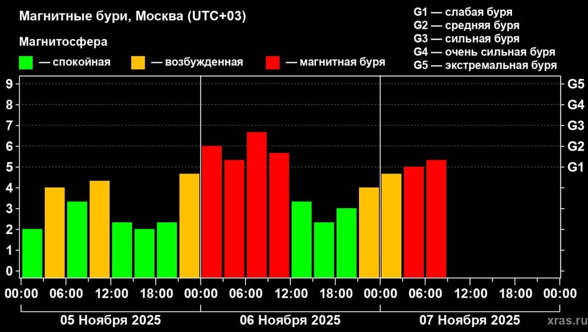 7 ноября, по данным Лаборатории солнечной астрономии ИКИ и ИСЗФ, Земля переживает один из самых сложных геомагнитных дней года. Планета вошла в поток плазмы от крупной корональной дыры и одновременно столкнулась с последствиями двух мощных солнечных вспышек, произошедших двое суток назад. Скорость солнечного ветра сейчас достигает 700-800 км/с при норме в 300-400, а температура плазмы вокруг Земли выросла почти в десять раз – до полумиллиона градусов. Пока наблюдаются магнитные бури уровней G1-G2, но в ближайшие часы их сила может возрасти до G3-G4. Основной удар ожидается в течение суток, когда к Земле подойдут основные массы выброшенной солнечной плазмы. По предварительным прогнозам, плотные слои выбросов должны пройти мимо планеты, однако если произойдёт прямое попадание, уровень бурь может достичь максимальной отметки G5. О том, как метеозависимым людям избежать негативного влияния магнитных бурь на здоровье, читайте в нашем материале. Также на ТИА: Ночь желаний: в ноябре жители Тв