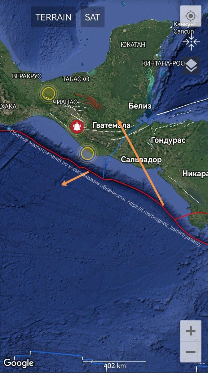 Есть вероятность землетрясения М6+ в районе Сальвадора или Гватемалы в течение 9 дней ===== There is a possibility of an M6+ earthquake in the area of El Salvador or Guatemala within 9 days.