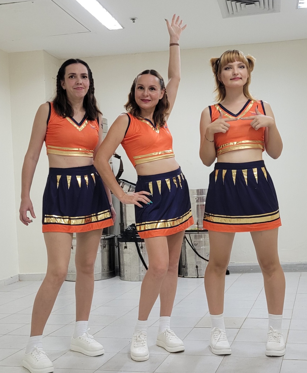 Следующая была очередь моей команды. А у нас всё никак не получалось синхронности. Одна девочка из нашей команды очень волновалась что у неё ничего не получается. Пока нам сооружали сцену наш хореограф в который раз поменял движения и мы окончательно запутались.