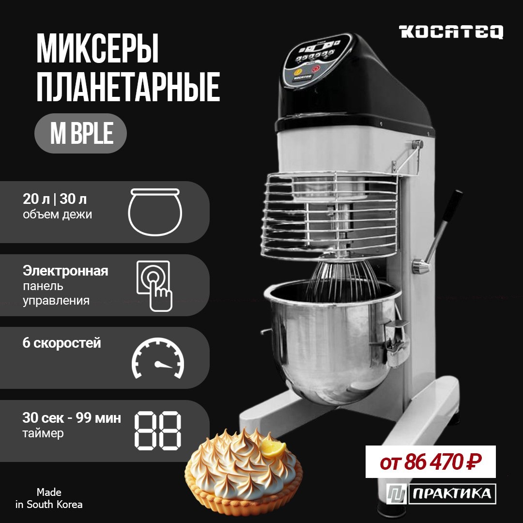 🧁 ПЛАНЕТАРНЫЕ МИКСЕРЫ KOCATEQ M BPLE На что мы советуем обратить внимание при выборе планетарного миксера: расскажем на примере новых миксеров M BPLE. ◽️ Расчёт производительности под объём производства Важно оценить, сколько продукта вы планируете производить ежедневно или в смену, и подобрать миксер, который соответствует этому объёму с некоторым запасом. Например: если планируется выпуск теста или крема в количестве X кг за смену, выберите чашу и мощность, которые обеспечат это количество за 1-2 замеса, а не 5-6. Также учитывайте возможный рост производства: если через год-два объём будет больше, есть смысл сразу брать модель с запасом мощности, чем менять оборудование. ◽️Объём дежи Объём дежи напрямую влияет на то, сколько партий продукта можно приготовить за один заход. Правильный выбор объёма помогает избежать перегрузки или, наоборот, работать неэффективно. M 20 BPLE – объем дежи 20 литров (максимальная загрузка муки 3 кг) M 30 BPLE – объем дежи 30 литров (максимальная за