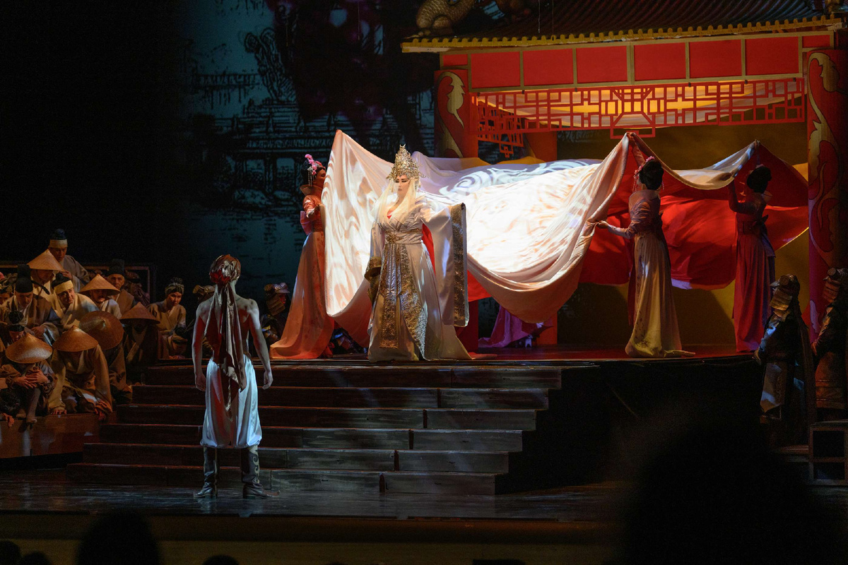 Четвертый сюрприз – избранная постановочная стилистика, общая эстетика спектакля. На весьма небольшой сцене «Коми-оперы» режиссер Николай Покотыло в содружестве со сценографом Эрихом Вильсоном, художницей по костюмам Татьяной Кондрычиной, хореографом Дмитрием Пимоновым и световиком Сергеем Шевченко создает пленяющее красотой сказочное действо, классическое в своей основе, повествующее о традиционном Китае (или наших представлениях о нем). В центре, чуть в глубине, на невысоком ступенчатом подиуме – изящная пагодообразная беседка с неизменными китайскими драконами на углах крыши, по бокам от нее – две трибуны, на которых располагается любопытствующий плебс, за ними же время от времени прячутся пришельцы из Татарии (Калаф, Тимур и Лиу). Вот, собственно, и все – пространство решено просто, компактно, но необходимые акценты расставлены – у публики полное ощущение, что она заглянула за таинственные стены знаменитого Запретного города. Меняются задники, напоминающие традиционную живопись Поднебесной тушью по шелку – они не только добавляют экзотического колорита, но и «реагируют» на события оперы – в остродраматические моменты изображения на нем становятся инверсионными, как на фотонегативе.