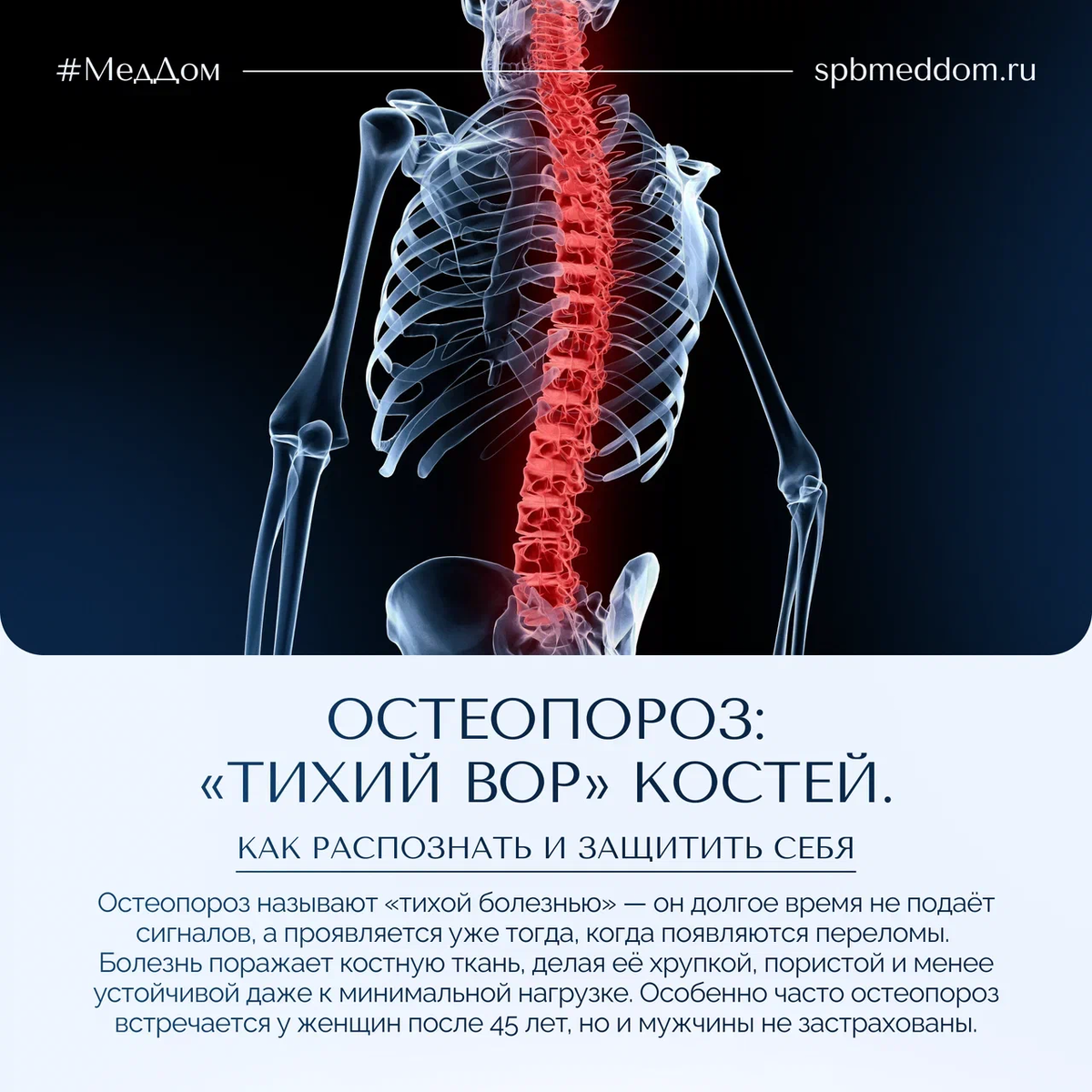 Остеопороз называют «тихой болезнью» — он долгое время не подаёт сигналов, а проявляется уже тогда, когда появляются переломы. Болезнь поражает костную ткань, делая её хрупкой, пористой и менее устойчивой даже к минимальной нагрузке.