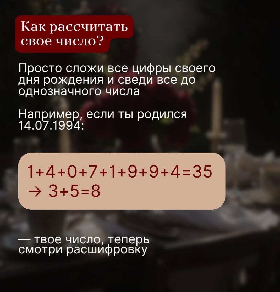 🖇️Стресс и тревога не появляются просто так 🖇️Они приходят, когда ты живёшь не в своём ритме. Когда делаешь «через силу и не хочу» 📎Но ключ к спокойствию уже есть в тебе — он зашифрован в твоём числе судьбы 🌺 Каждое число несёт особую энергию — понимание её помогает найти внутренний баланс, снять напряжение и снова почувствовать жизнь в теле 😊Как рассчитать своё число? Сложи все цифры своей даты рождения⤵️ Например: 14.07.1994 → 1+4+0+7+1+9+9+4 = 35 → 3+5 = 8 😊Хочешь узнать, какая сила помогает справляться с тревогой именно тебе?🙂🙂🙂 ▫️Напиши в комментариях своё число судьбы — и я подскажу, как твоя энергия поддерживает тебя в сложные моменты🙂