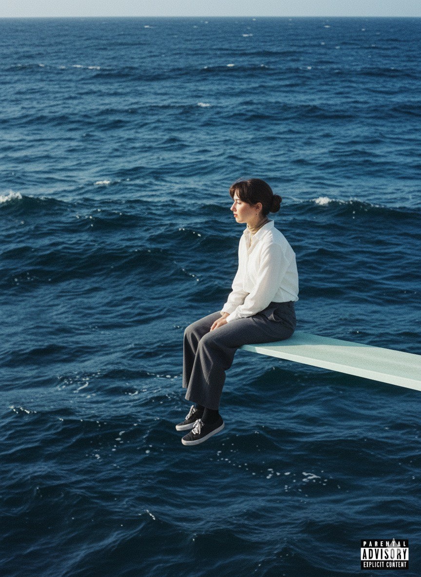 Морской вайб заказывали? Осенью часто не хватает атмосферы моря и тепла, поэтому мы решили порадовать вас промптами с водной тематикой 🌊 Для всех генераций нужен Gemini и фото в хорошем качестве 🫡 1⃣ Промпт для фото на пирсе: The album cover scene is a square-format cinematic photograph featuring one person sitting in a relaxed position on the very edge of a white diving board, extending into the frame from the right side over an endless ocean. Neither the horizon nor the land is visible — only layered, textured waves filling the entire background. The person wears a simple, minimal outfit: a light shirt, loose dark trousers, and dark shoes. The composition follows the rule of thirds — the subject is positioned on the right third of the frame, facing slightly toward the left, captured at eye level in a calm three-quarter profile. The chin is gently raised, legs hang freely, and hands rest naturally on the knees. The diving board forms a nearly horizontal leading line into the scen