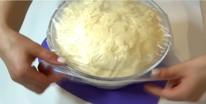 - Создаём парниковый эффект. Формируем шар, смазываем его каплей масла, накрываем миску полотенцем или плёнкой и отправляем в тёплое место.