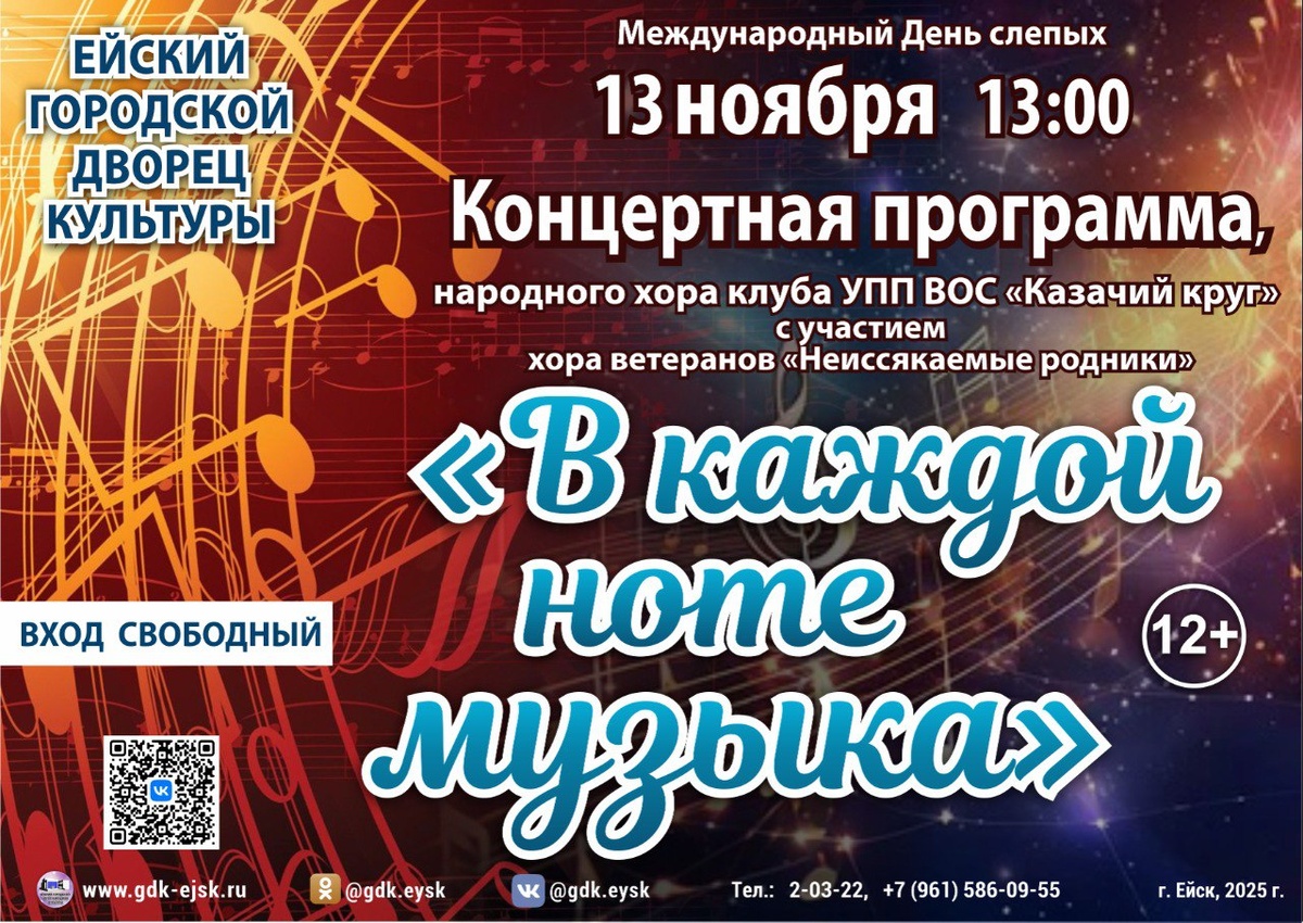13 ноября в 13:00 зазвучит особый аккорд — концертная программа «В каждой ноте музыка», посвящённая Международному Дню слепых. Народный хор «Казачий круг» учебно-производственного предприятия Всероссийского общества слепых подарит зрителям песни, сотканные из глубин народной мудрости и искреннего таланта. Хор ветеранов «Неиссякаемые родники» окунёт слушателей в тёплые воспоминания молодости, бережно сохраняя музыкальное наследие поколений. А творческий коллектив «Парус» вдохновит своей поэзией и музыкой, подобно парусу корабля, смело идущего навстречу ветрам судьбы. 🚀 Подписывайтесь: @gdk_ejsk