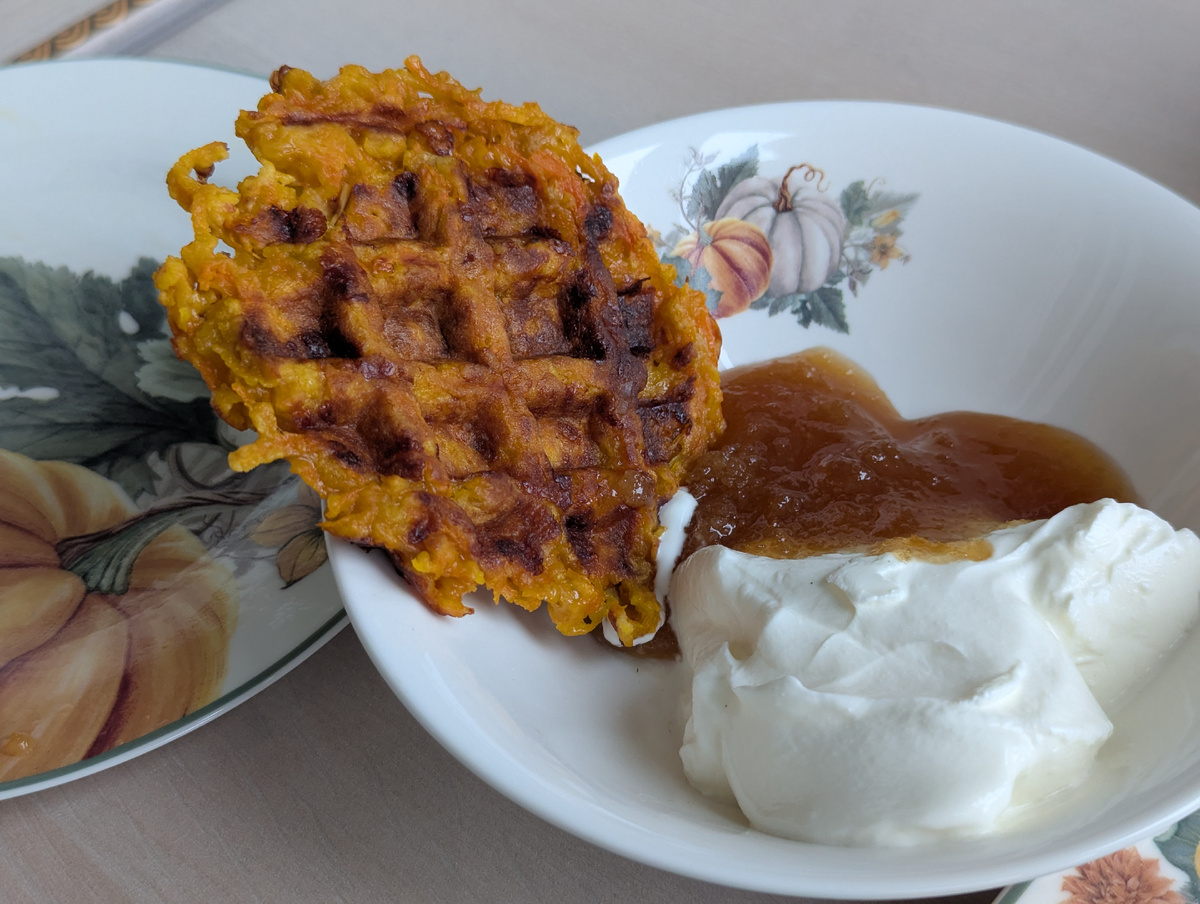 Эх, надо было назвать статью "Танцы с тыквой", как учат гуру "для привлечения контента". Я действительно, с тыквой "танцевала" - часть запекла и заморозила, часть просто заморозила, положила семечки сушиться (для птичек зимой), напекла вафель. Эти вафли-оладьи я сделала без сахара, но ела их с мёдом. Чтобы вам не искать по тексту, сразу расскажу про вафли вкратце, потом подробнее и попутно, что сделала со всей тыквой. А вкратце так. У меня тыква размером с дыньку колхозницу. Для вафель нужно: Тыква 3 ломтика Яблоко большое (у меня Антоновка) Тыква и яблоко на крупной тёрке (комбайн), тыквы примерно в 3 раза больше, чем яблока Яйцо Мука 3 ложки с большой горкой Сыр тертый - 3 горсти Ни сахара, ни соли не добавляла. Масло растительное смазать панели вафельницы. Пекла в вафельнице Мультипекаре - долго и нудно, примерно по 5 минут (это долго) на каждые 2 вафли. Всего 8 вафель получилось. Начинаю "танцевать" Все знают - тыкву вымыть. Вытащить семечки, я ложкой себе помогала. Разрезат