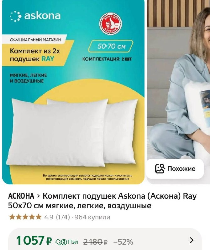 Комплект подушек Askona (Аскона) Ray 50х70 см мягкие, легкие, воздушные 2 шт https://market.yandex.ru/cc/7x9wXG BER103-AF — скидка 100₽ на один любой заказ от 5000₽ ✅ Подписаться 🔣 Промокоды тут