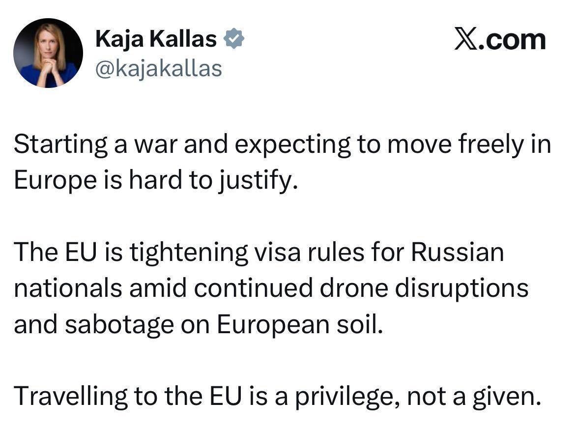Не смогли пройти мимо комментария, который оставила глава евродипломатии Кая Каллас. Естественно, по визам. Обычно мы обращаем внимание на наших подписчиков, но тут особый случай. «ЕС ужесточает визовые правила для граждан России на фоне продолжающихся инцидентов с дронами и диверсий на европейской территории. Поездка в ЕС — это привилегия, а не данность», - написала она в соцсети. Ответим ей достойно? 😳 @tourdom