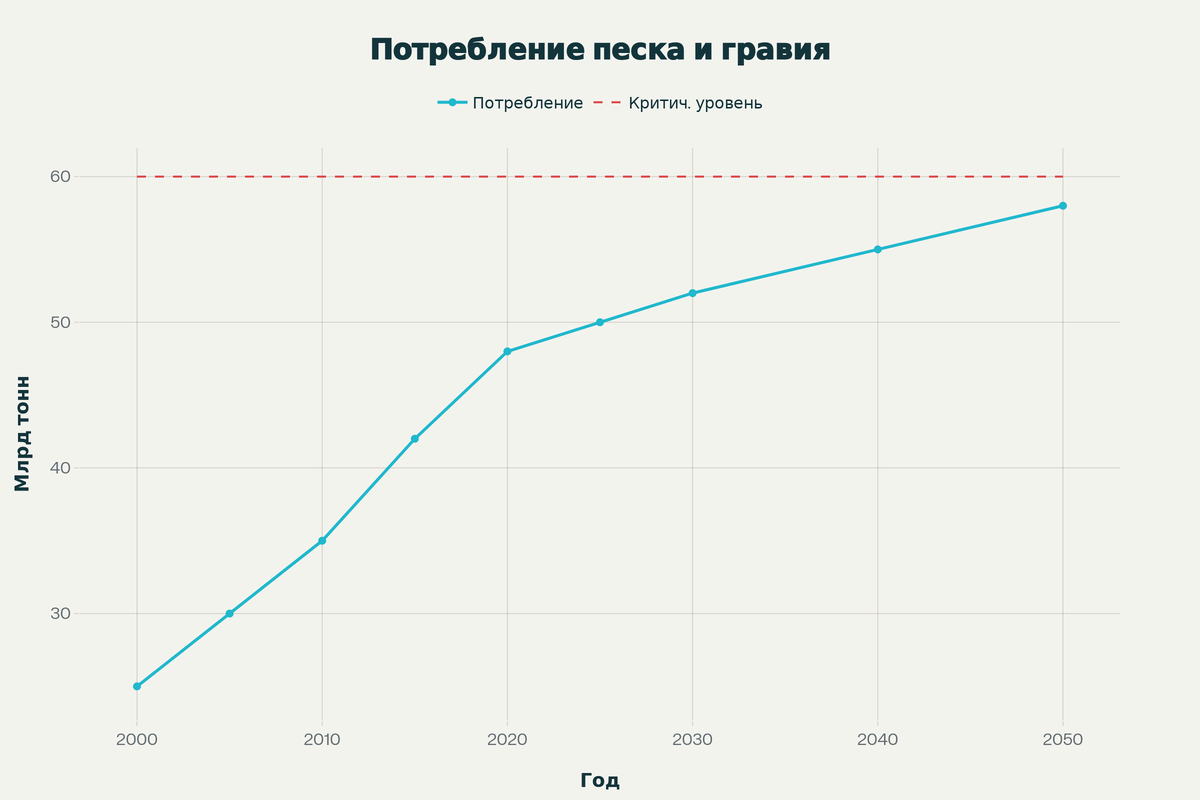 Авторитетные источники предупреждают: если сохранится текущий темп потребления, глобальные запасы добываемого песка могут истощиться в течение следующих 50–70 лет. Это вызовет цепную реакцию: рост цен на строительство, невозможность реализации инфраструктурных проектов, особенно в развивающихся странах.
