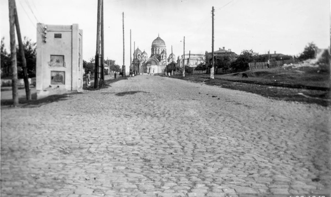 Фотография, примерно конец июля 1942 года, во время фашистской оккупации Ростовской области, город Новочеркасск. Церковь пресвятой богородицы «Всех Скорбящих Радости» на Новочеркасском подворье Старочеркасского женского Ефремовского монастыря. Построена в 1893-м году в Новочеркасске в память спасения царской семьи при крушении 17 октября 1888 года у станции Борки Курско-Харьковской железной дороги. на скорости 90 км. ч. (вся семья осталась невредимой). Закладка прошла в мае 1891 года. В 1920-м году монастырь был закрыт. Храм был закрыт в 30-х годах. Частично разобрано здание было в 1942-м году для постройки баррикад на спуске. Окончательно разобран в 1950-м году, а на его месте возведена коробка трехэтажки.. Фото 3
