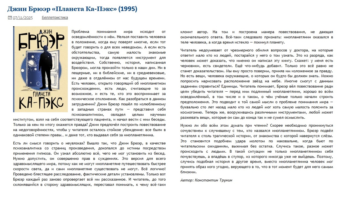 Джин Брюэр "Планета Ка-Пэкс" (1995) | Критика