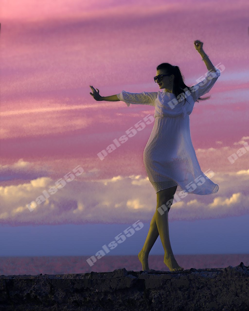 Прощание с летом! Последние дни лета окутаны нежным светом заката. Небо, словно акварель, горит розово-фиолетовыми переливами. На фоне морской линии — девушка в белом лёгком платье, она танцует босиком на бетонной дамбе у берега морского, словно ловит каждое дыхание уходящего лета. Ветер играет с подолом её платья, а движения полны свободы и радости, как прощальный гимн теплу, солнцу и беззаботности. Её танец — это благодарность сезону, это счастье быть в моменте, когда море и небо становятся единым чудом. Её босые ноги скользят по шершавому, ещё тёплому от солнца бетону, чувствуя каждую песчинку, каждую трещинку. Вокруг разбросаны ракушки, выброшенные прибоем, и пятна высохшей соли, сверкающие, как крошечные алмазы. Воздух густой и солёный, он пьянит, как нектар из спелых персиков, смешанный с горьковатым дыханием приближающейся осени. В её танце нет заученных движений, только чистая импровизация. Она раскинула руки, словно хочет обнять весь горизонт — и розовеющее небо, и первую р