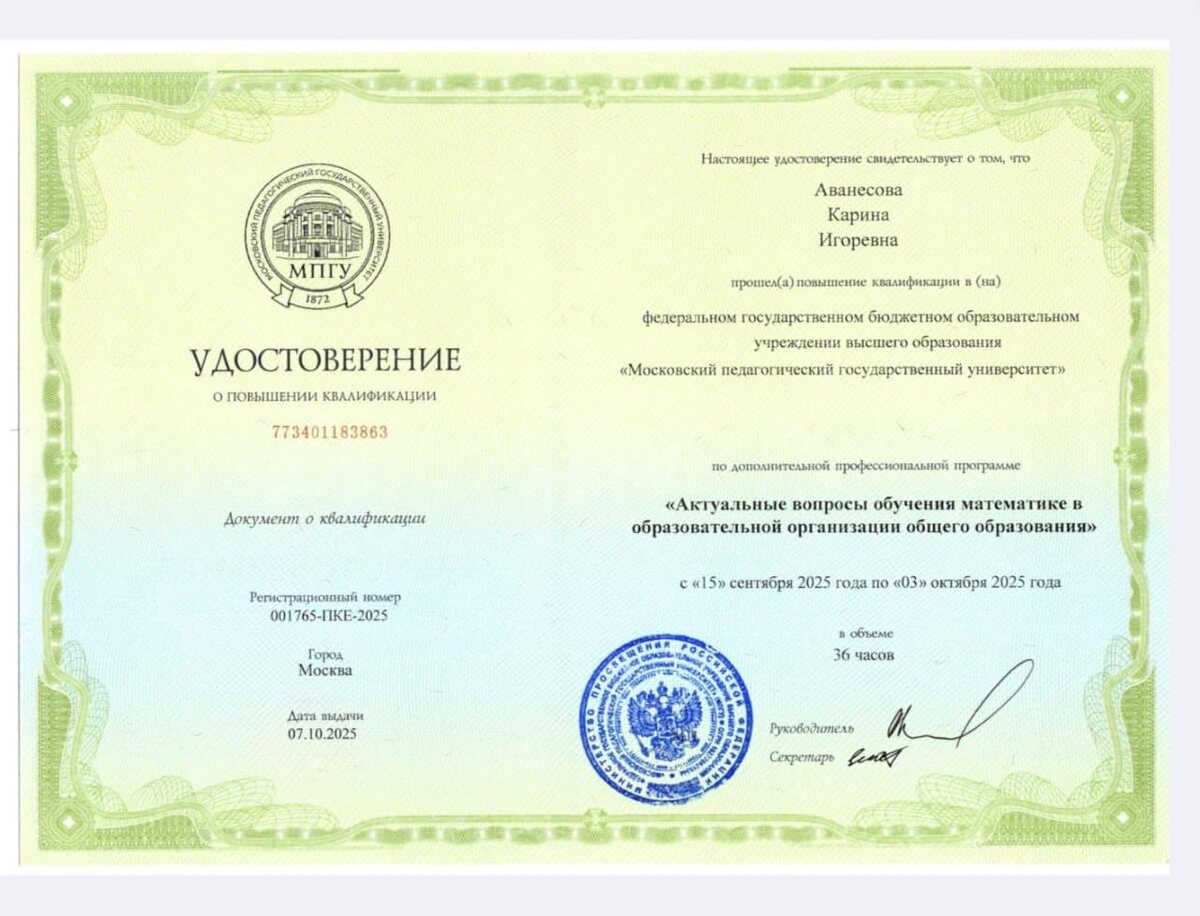 Наш учитель математики Аванесова Карина Игоревна успешно окончила курсы повышения квалификации МПГУ по теме "Актуальные вопросы обучения математике в общеобразовательной организации общего образования"! В программе курса были рассмотрены вопросы проектирования, конструирования, организации своей педагогической деятельности, разработка и проведение, различных по форме обучения занятий, наиболее эффективных при изучении соответствующих тем и разделов программы, в том числе при подготовке к ОГЭ и ЕГЭ, адаптируя их к разным уровням подготовки учащихся, а так же умение разрабатывать (осваивать) и применять современные психолого-педагогические технологии при изучении задач повышенной и высокой сложности при ГИА