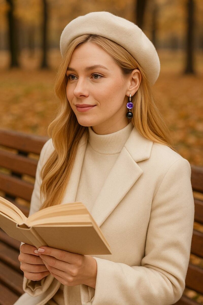 🌸 Как носить аметист? Фиолетовый особенно красиво раскрывается на фоне серого, белого, дымчато-розового, нежно-голубого и бежевого. Эти цвета подчёркивают его прозрачность и не перетягивают внимание. 💎 Советы от стилиста: • Если у вас светлая кожа и холодный подтон, выбирайте аметист в серебре — камень подчеркнёт чистоту цвета лица и сделает взгляд глубже. • Тёплый подтон кожи (золотистый, персиковый) дружит с фиолетовым оттенком, если рядом есть мягкие тёплые ткани — например, песочный свитер, молочная блузка, карамельный шарф. • В повседневности — достаточно маленьких серёг или кольца с аметистом: он даёт лёгкий акцент, не требуя «праздничного» повода. • На вечер — попробуйте монохромный образ в сером или лавандовом и добавьте кулон или брошь с крупным камнем. Это создаст аристократичный, но современный эффект. 🎀 На нашей ИИ модели прекрасные серьги с аметистом и черным ракушечным жемчугом, которые станут прекрасным украшением как на выход, так и для повседневной носки! ✨Ц