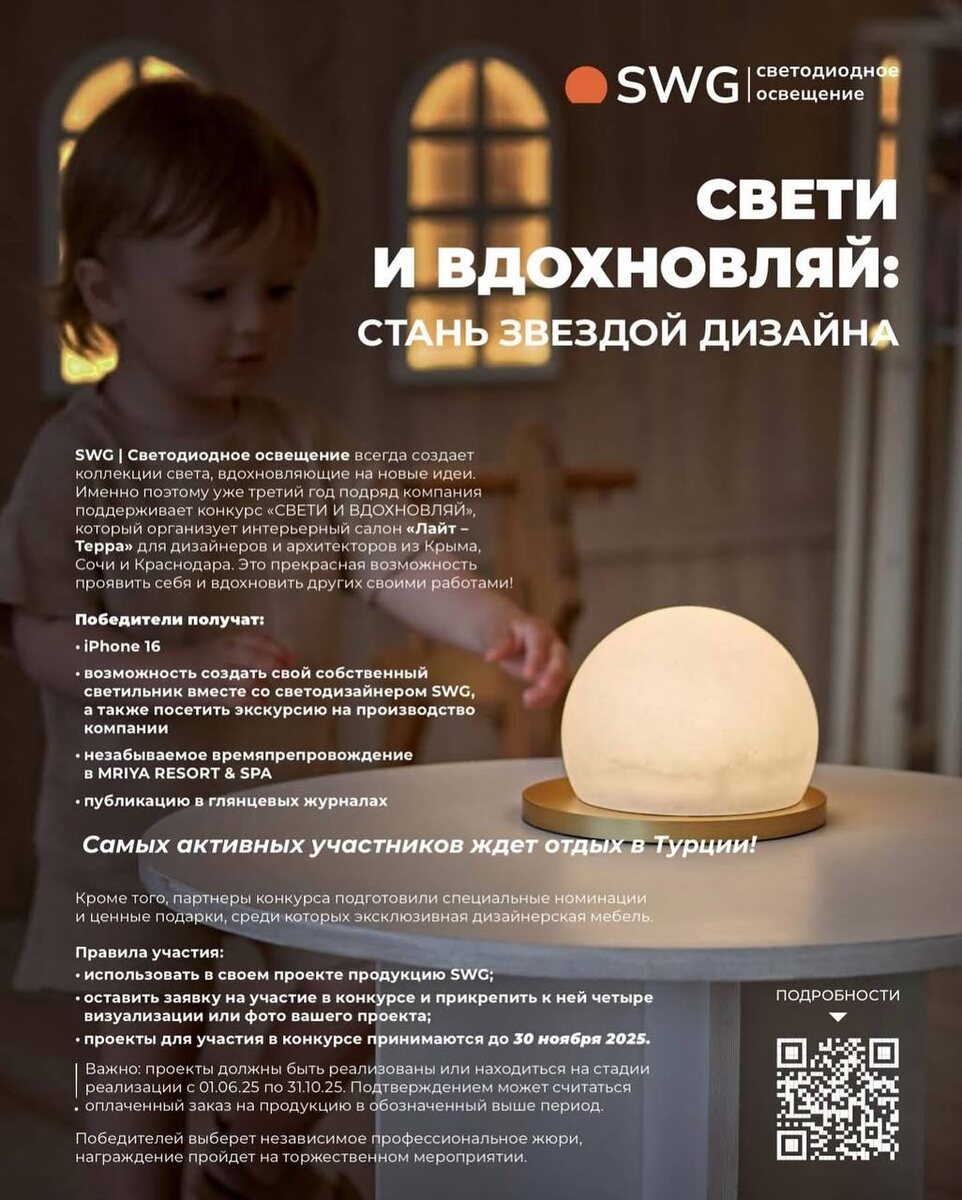 Дарим путешествие в Турцию, iPhone 16, публикацию в журнале BRUSNICA и Hi-Home, создание светильника совместно с SWG🤩 Конкурс для дизайнеров и архитекторов Крыма, Сочи и Краснодара. ПРИЁМ ЗАЯВОК ПРОДЛЁН ДО 30 НОЯБРЯ! У вас есть целый месяц, чтобы заявить о себе и показать свой свет! УЧАСТВУЙТЕ И ВЫИГРЫВАЙТЕ: 📱 iPhone 16 🌴 Отдых в Mriya Resort & SPA 💡 Создание собственного светильника с SWG 📖 Публикация в журнале BRUSNICA и Hi-Home 🇹🇷 Путешествие в Турцию для самых активных! Призы от партнёров: дизайнерская мебель и эксклюзивные подарки! КАК УЧАСТВОВАТЬ: 1. Используйте продукцию SWG в своём проекте. 2. Заполните заявку на участие. 3. Прикрепите 4 визуализации или фото проекта. 🕐 Проекты должны быть реализованы (или в процессе) с 01.06 по 30.11.25. Подтверждение — оплаченный заказ SWG. Подробности тут https://vk.com/event230927016 🏆Победителей выбирает независимое жюри: Тарас Бондаренко, Стелла Кондратьева, Диана Калинкина, Дмитрий Юдалевич. И, конечно, будет голосован