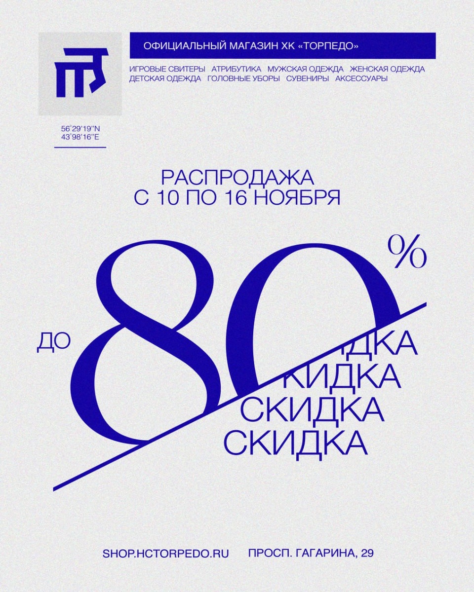 🎯 Большая распродажа в официальном магазине «Торпедо»! С 10 по 16 ноября — скидки до 80%! Игровые свитеры, мужская и женская одежда, детская коллекция, аксессуары и сувениры — отличный повод обновить фанатский гардероб. 📍 КРК «Нагорный», пр-т Гагарина, 29 🌐 shop.hctorpedo.ru Успей выбрать лучшее — количество товаров ограничено! 🔥