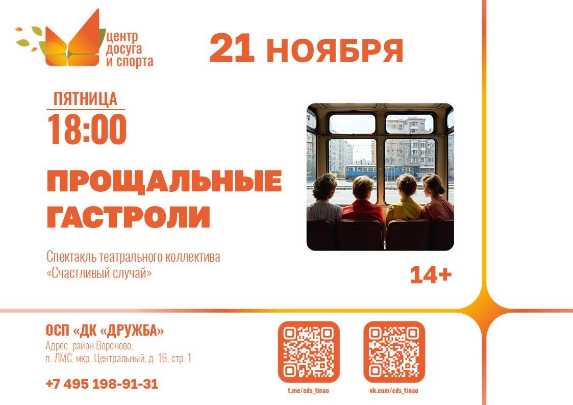 🚂💖 ""ПРОЩАЛЬНЫЕ ГАСТРОЛИ"": Поезд отправляется в мир страстей! 💖🚂 Театральный коллектив «Счастливый случай» (рук. Г.Е. Карганова) приглашает на спектакль, который уже покорил сердца зрителей! Сюжет: Одно купе поезда. Четыре провинциальные актрисы едут на гастроли. Их диалоги полны упоминаний о главном режиссере Льве Никитиче... и вскоре становится ясно, что все они влюблены в него! Две бывшие жены, нынешняя и верный друг — как им удается сохранять почти семейные отношения? ✨ Узнайте сами! Это душевная, смешная и трогательная история о любви, дружбе и театральных интригах, которую провожают овациями! ✨ 🗓️ 21 НОЯБРЯ, ПЯТНИЦА ⏰ 18:00 📍 ОСП «ДК «ДРУЖБА» (п. ЛМС, мкр. Центральный, д. 16, стр. 1) 🔞 14+ 📞 Инфо: +7 495 198-91-31 Не пропустите этот невероятный спектакль! #новостивороново #новоститинао #анонсывороново #анонсытинао