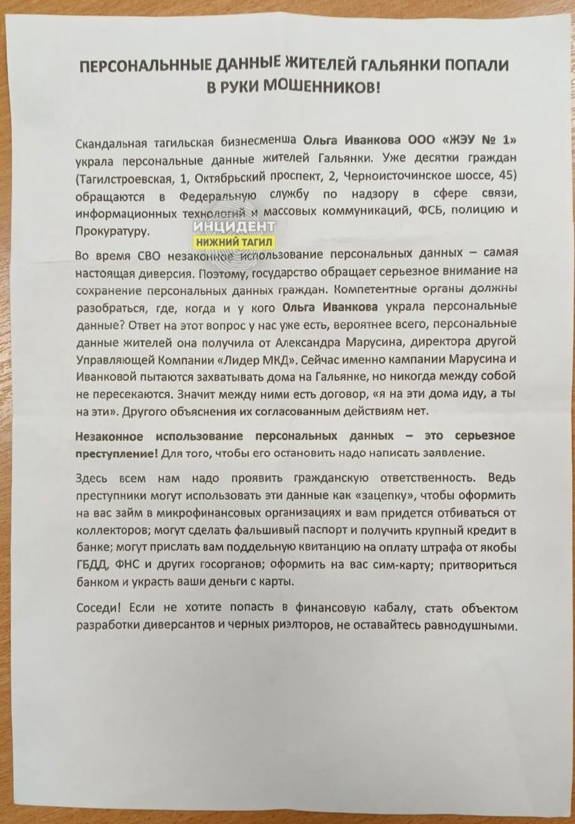 ⭕ Жители многоэтажки на Октябрьском проспекте приходят странные письма, якобы отправленные от «ЖЭУ № 1» В почтовые ящики подъездов дома № 15 по Октябрьскому проспекту «доброжелатели» раскидали по почтовым ящикам письма, якобы отправленные от «ЖЭУ № 1». Однако её дом находится в ведении «СтройСервиса». Жители дома озадачены и не понимают, что происходит. — Кто-то из жителей предполагает, что это могли сделать сами представители компании «Строй Сервис», а кто-то, что это могли сделать сами жители дома, после интересных событий: наш дом планирует переходить в «Лидер МКД», и после собрания с ними собственникам начали звонить мошенники, а чуть позже после этого в беседе были обсуждения того, почему старшие по дому не захотели общаться с ЖЭУ №1, просто сказав, что УК не заинтересованно отвечает, а после так совсем, что они отказались, но доказательства предоставить не смогли 😢, — рассказывает подписчица сообщества «Инцидент Нижний Тагил» После собрания, на котором обсуждались эти планы,